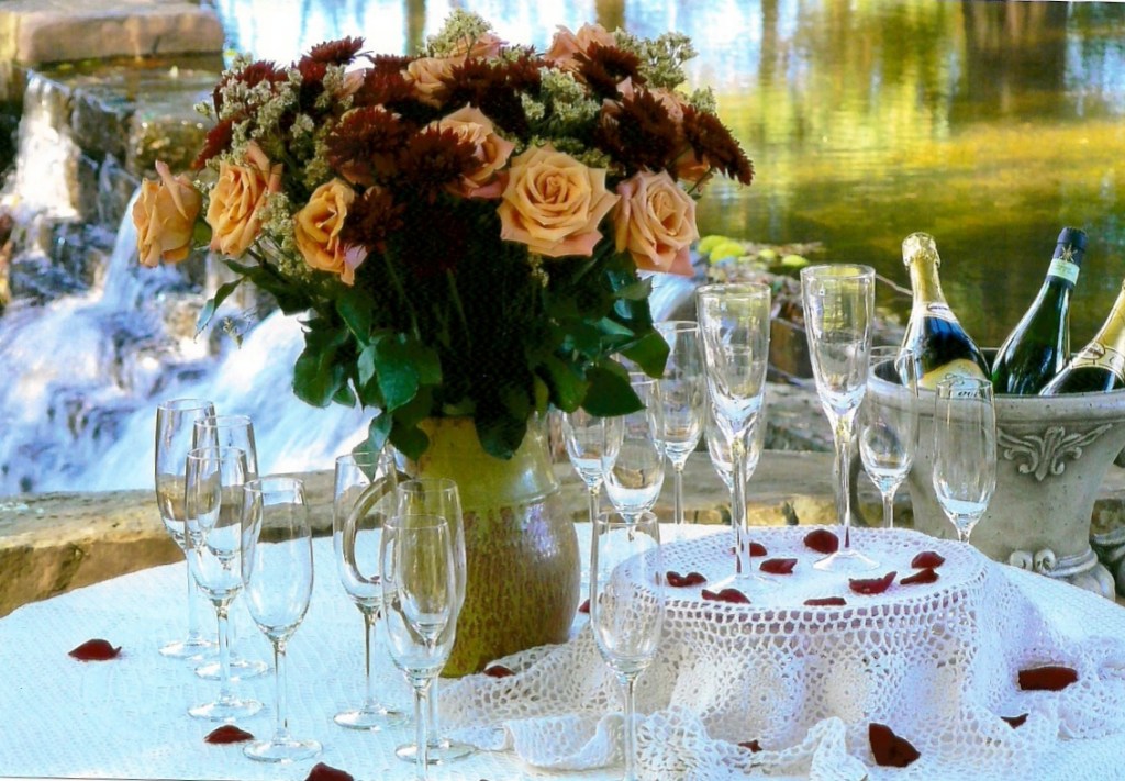 All Champagne and Wedding Toast packages are based on availability for the desired date and time of your event. This is a Seasonal event and is not offered during the Winter months. Our Champagne Toast or the Wedding Toast is traditionally held along the beautiful Creekside by the Chapel. Alcoholic beverages are limited to Champagne or Sparkling Wine for all events.